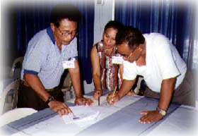 Meanwhile, Learning Area Coordinator Ma. Fe Portigo, ably assisted by a social work intern from St Theresa’s College, is in the thick of preparations for participatory coastal resource assessment at the barangay level. One barangay, Caw-oy, completed its resource assessment last December 7, and the CRMP team is now laying the groundwork for the assessment of resources in other barangays. It has been hard going, despite the islanders’ appreciation of what CRMP is trying to do, admits Portigo. "It is difficult to convince people to attend a workshop if that workshop is going to take them away from work," she explains. "A day’s work for most Olango fishers earns them only enough to feed their family for a day -- three days for these marginal fishers is too long a time to be away from work." CRMP Enterprise Development Specialist Monette Flores, assisted by 18 youth (18 to 30 years old) volunteers, has finished scanning the area for the best opportunities for enterprise development. Related to this, the Suba Women’s Group was organized in Barangay Sabang to undertake civic action projects and, when they’re ready, to take on some of CRMP’s livelihood development projects. They have already implemented a street beautification project in Sabang, lining the streets with concrete pots planted with colorful bougainvillea. . §